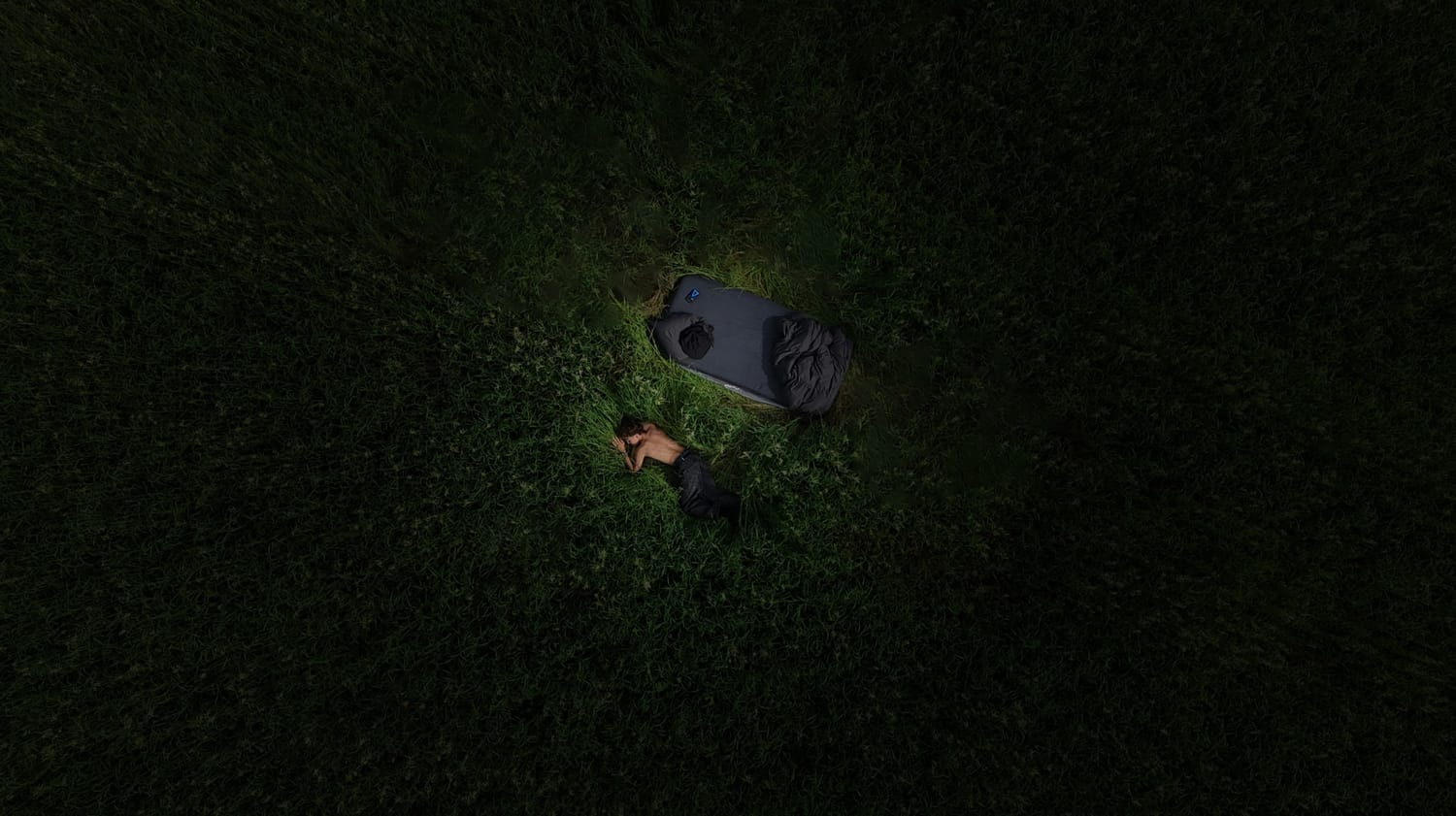 Pour ce projet, j’ai installé un lit au milieu d’un champ et j’ai fait des photos un peu dans le noir. Avec le drone, j’ai pu prendre des vues d’en haut, ce qui donnait un côté un peu surréaliste.